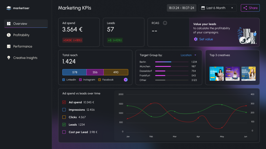 Analysiere alle Kampagnen in einem zentralen Dashboard, egal auf welcher Plattform du wirbst -